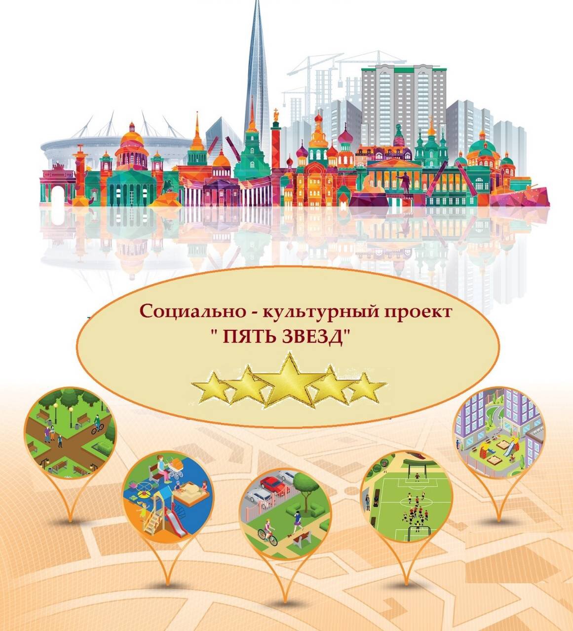 Название проекта «Пять добрых звёзд» отражает особенности Красногвардейского района, состоящего из пяти муниципальных образований, каждое из которых имеет свою историю и достопримечательности: «Ржевка», «Пороховые», «Полюстрово», «Малая Охта», «Большая Охта».